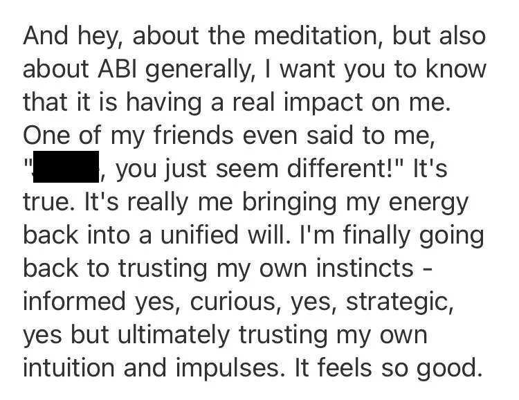 “Today I completed the 21-day cycle of our custom ABI guided hypnosis. I can honestly say that it gave me a level of relaxation that I haven't had in probably years.